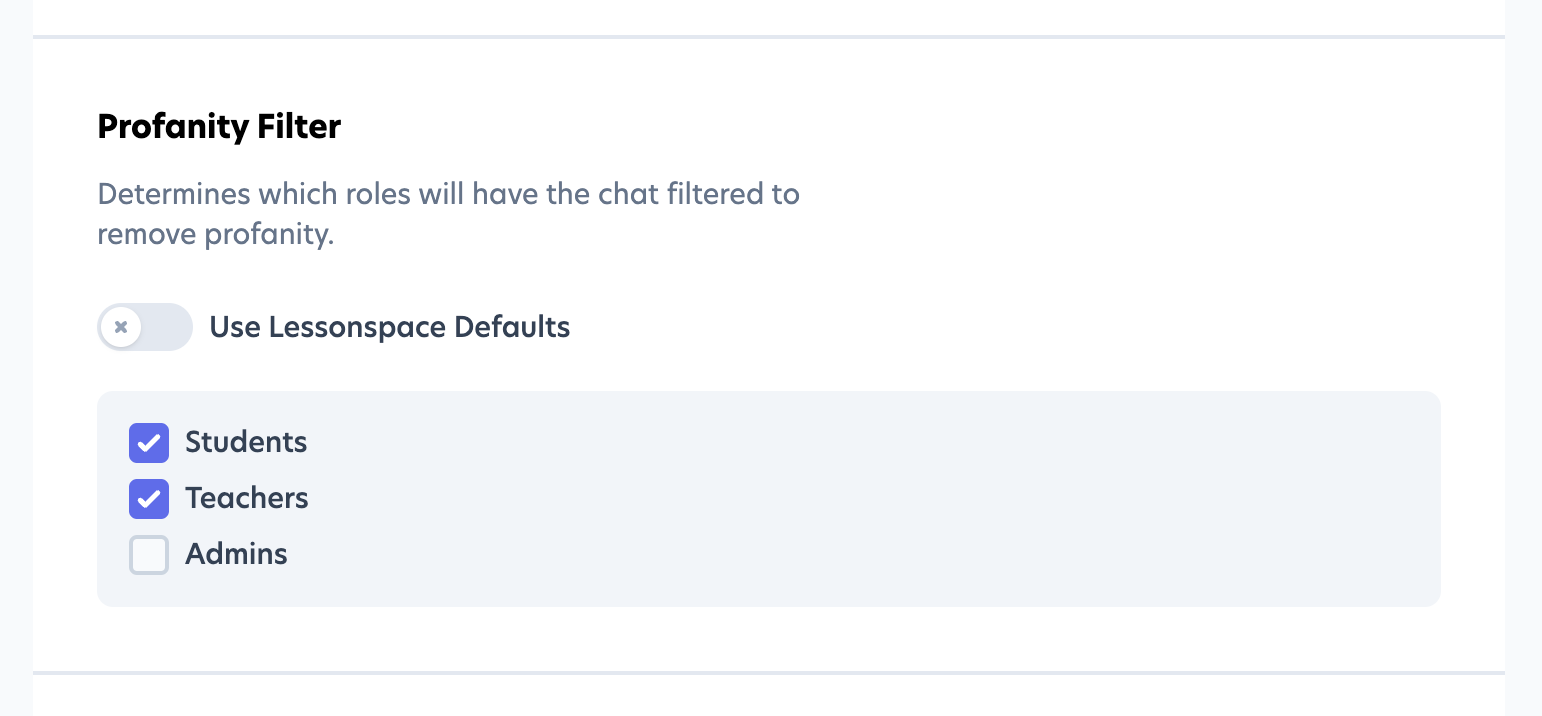 As always you can enable the profanity filter for students, teachers, and/or admins from the Spaces tab under Settings on your Lessonspace dashboard.
