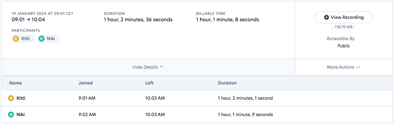 The session log details have been updated to include join and leave times for all participants in a convenient list format, along with the duration each participant spent in the session. Users can now download the CSV file of the log directly from the 'More Actions' dropdown menu.