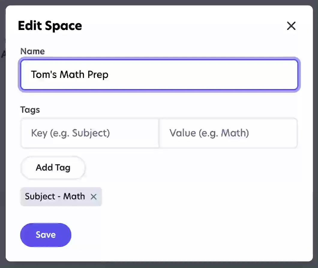 You can now give tags to Spaces. Tags are made up of a key and a value, both can be whatever you want e.g. "Subject - Math" or "Type - Test Prep" where "Subject" & "Type" are keys and "Math" & "Test Prep" are values.